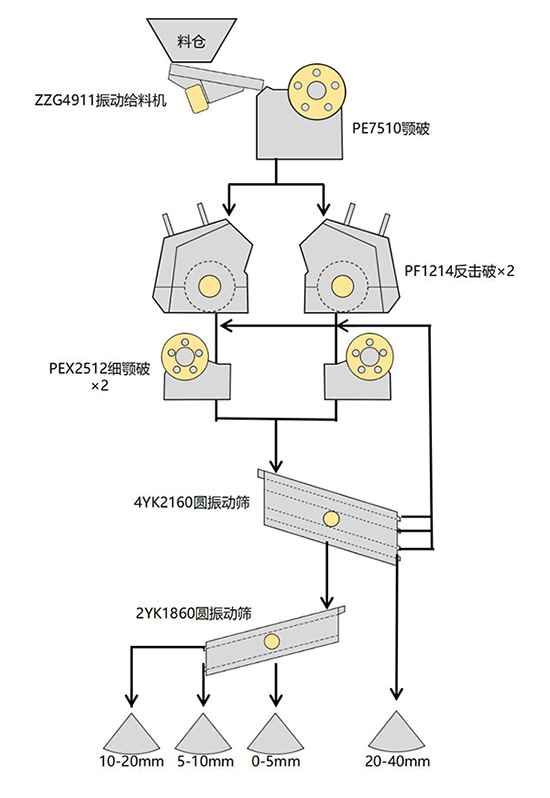 原料運輸車或者鏟車把原料倒入料倉,通過振動給料機均勻均速的把物料送入顎式破碎機,進(jìn)顎式破碎機初破之后再進(jìn)入到反擊破碎機中進(jìn)行二次破碎,二次破碎進(jìn)入4層圓振動篩中進(jìn)行初次篩分,大料返回到2臺細(xì)顎式破碎機中進(jìn)行粉碎,20-40mm成品篩分出來進(jìn)入到料堆,小于20物料進(jìn)入到下一個圓振篩中,篩分出10-20mm,5-10mm,0-5mm成品。